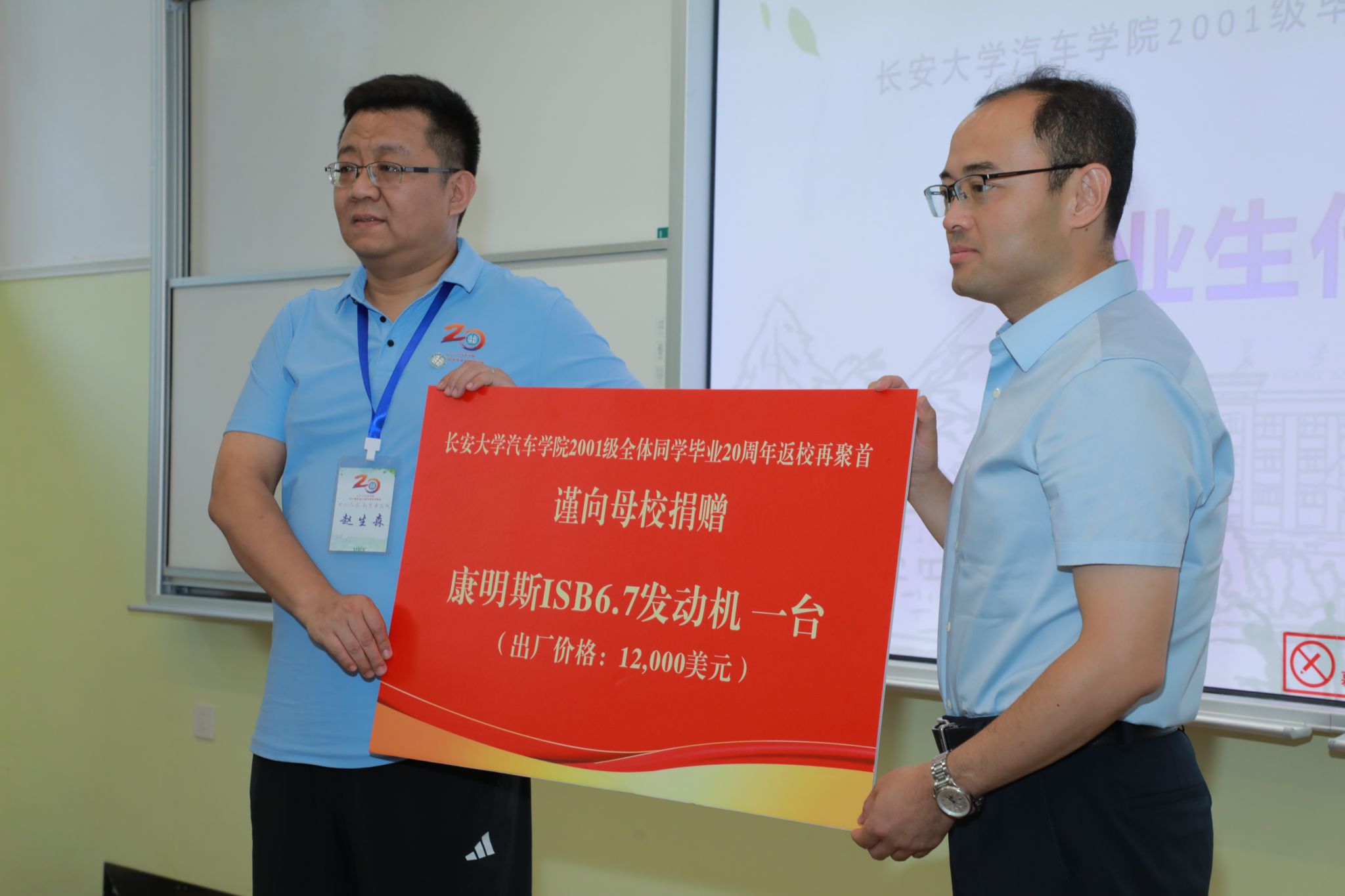 汽车学院2001级校友代表向学校捐赠康明斯发动机一台,承载全体学子对母校的深厚情谊;同时向现场教师代表献上鲜花,以此表达对恩师谆谆教诲的由衷感激。