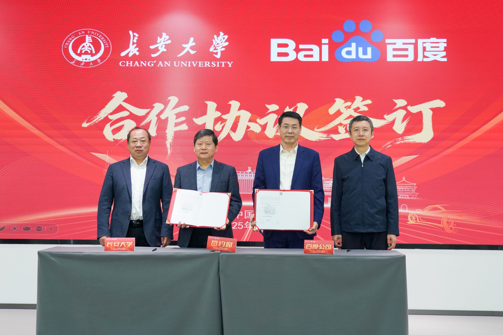 12月28日上午,长安大学与百度公司在北校区交通运输及智能装备创新建设平台举行合作签约暨车辆捐赠仪式。百度首席技术官王海峰、百度技术委员会理事长陈尚义,我校校长、中国科学院院士李树涛,我校教授、西安建筑科技大学校长赵祥模出席活动。中国交通运输协会城市交通分会会长、中国交通报社原党委书记、董事长蔡玉贺,我校北京校友会会长季求知等校友嘉宾出席并见证双方合作协议签署。仪式由我校副校长黎开谊主持。